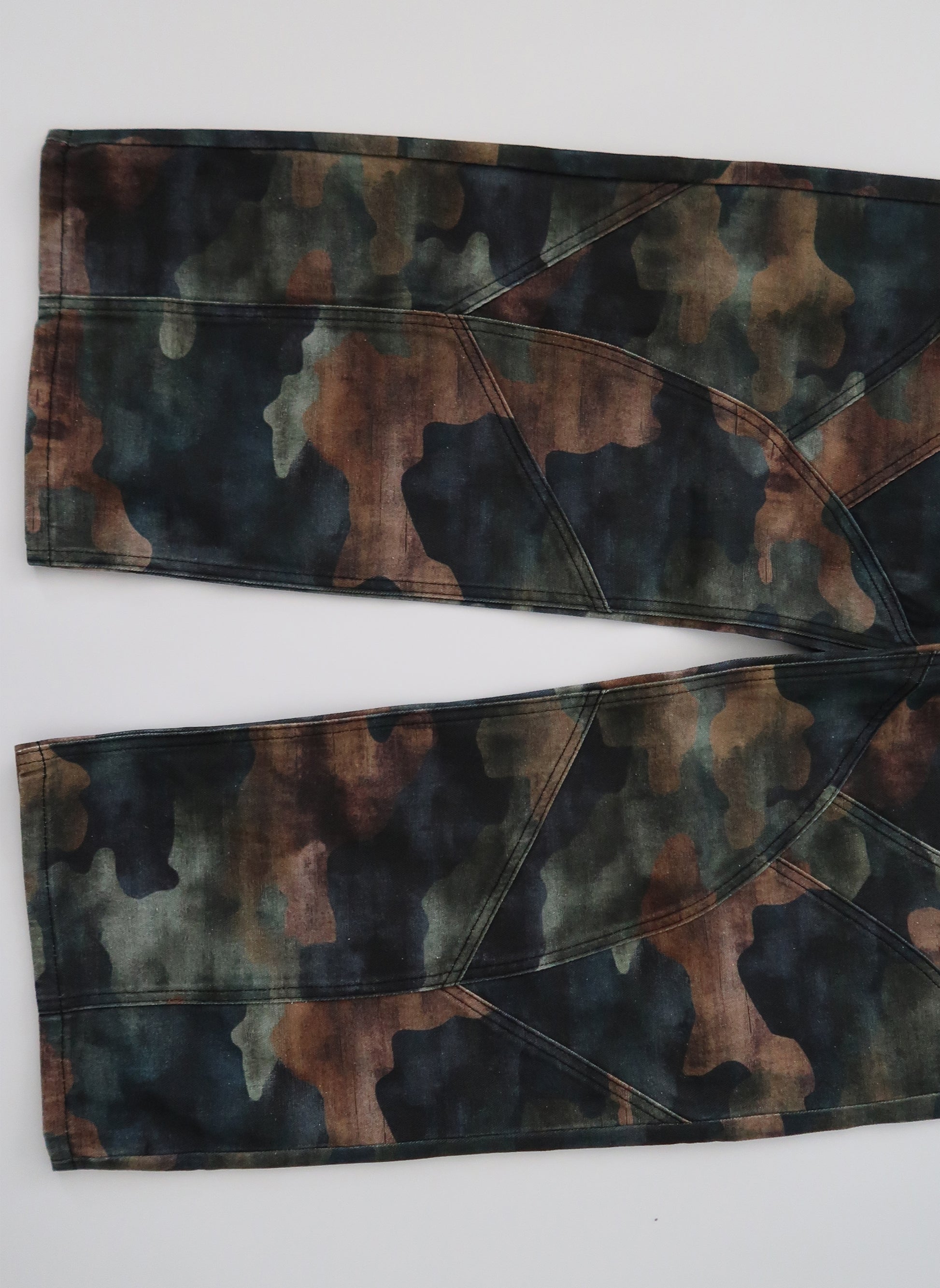 Camouflage pattern paired over 14 oz denim, featuring signature Mind Bowling hardware. Cut to a relaxed and baggy fit.