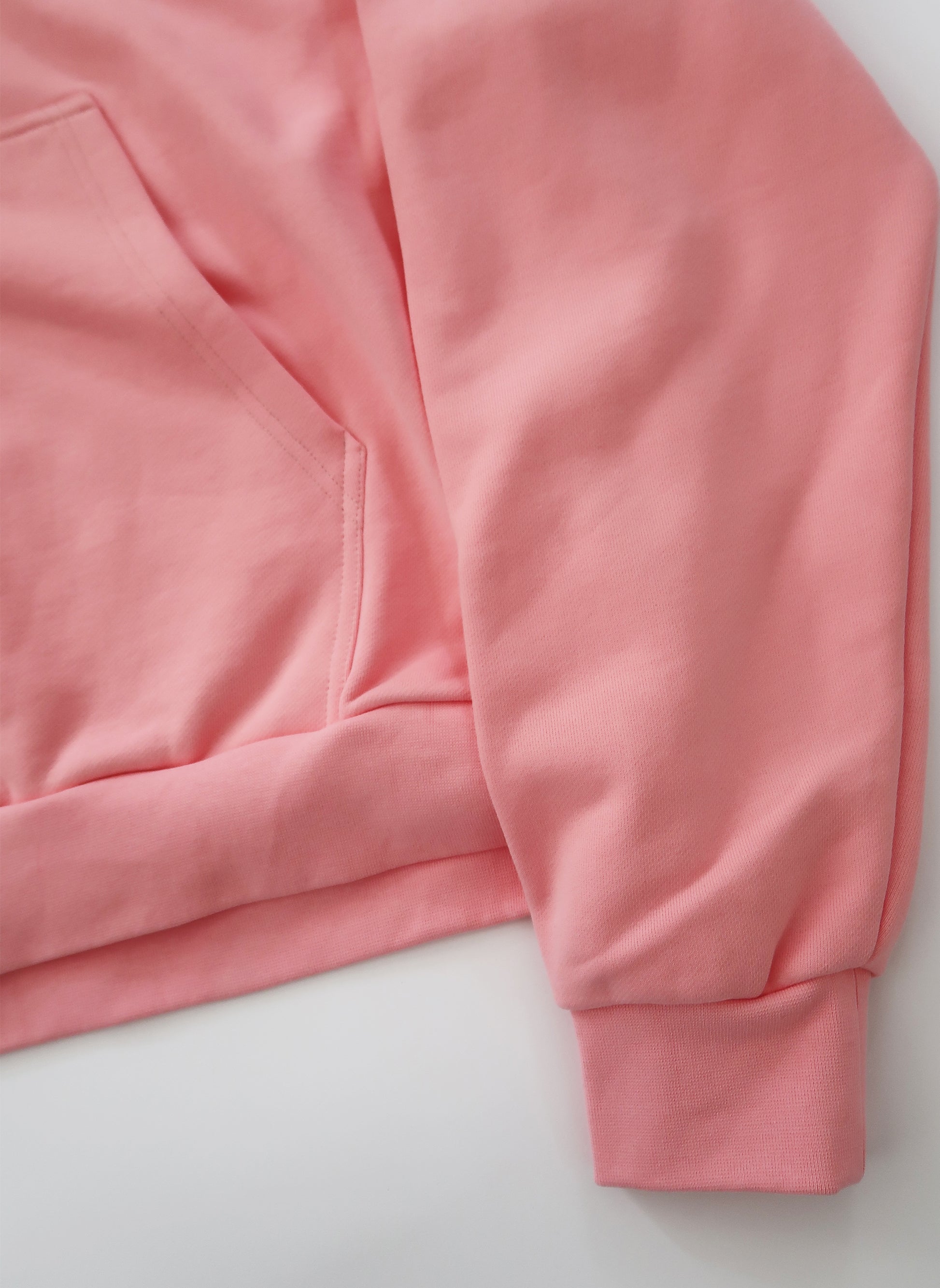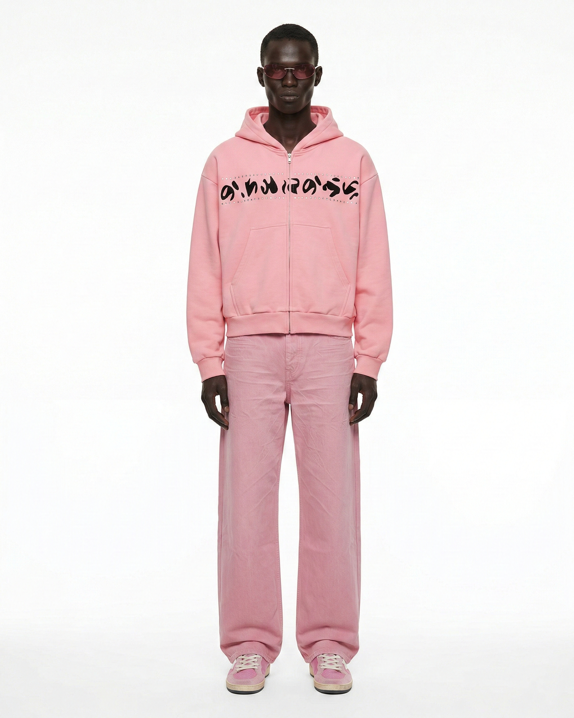 Hooded zip-up sweatshirt crafted from 500 GSM french terry, featuring chest embroidery and metal stud embellishments. Details include a front kangaroo pocket, and ribbed cuffs and hem. Cut to a relaxed and baggy fit.
