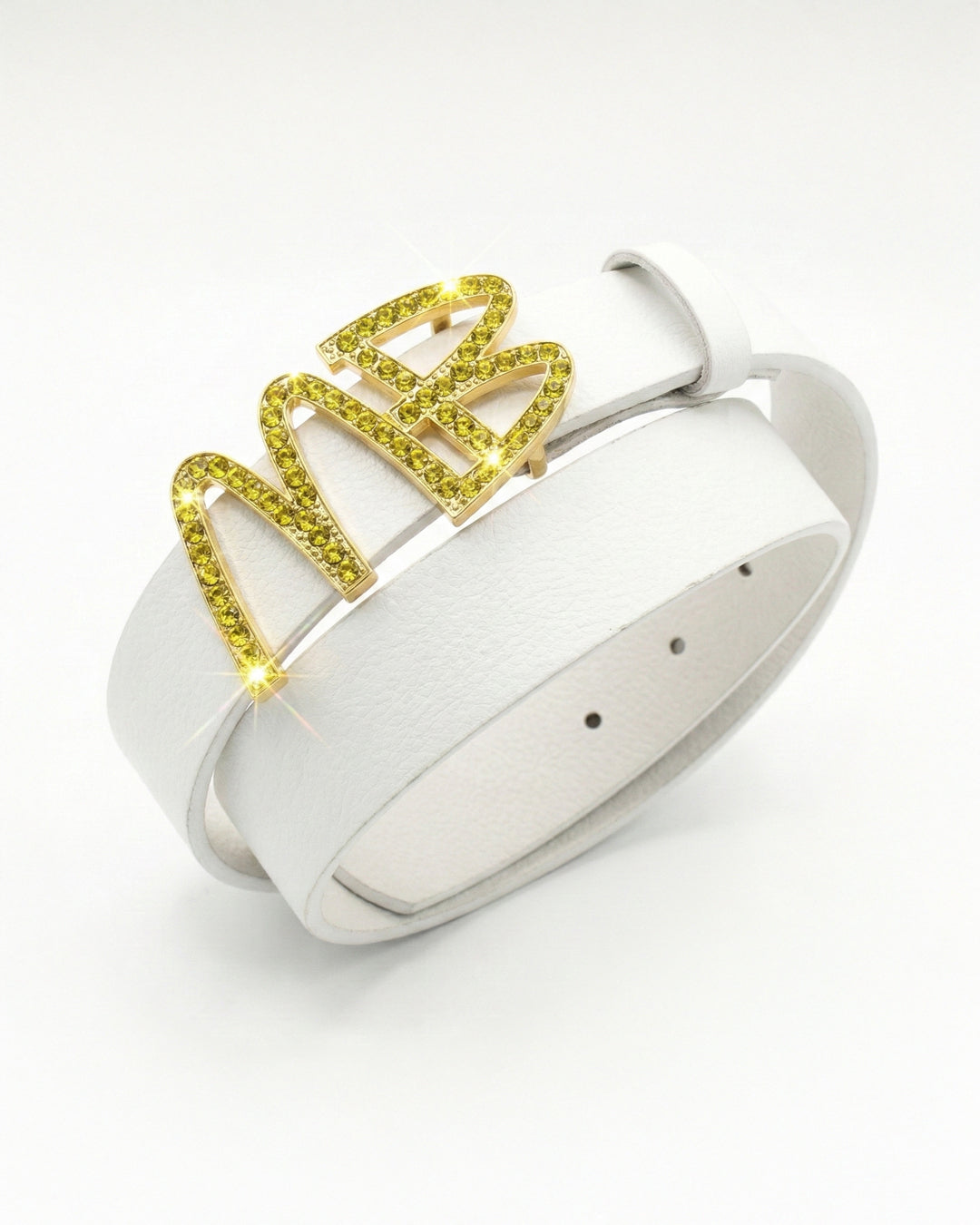 Mind Bowling's MCBelt features gold hardware with canary colored stones on a smooth grained leather belt.