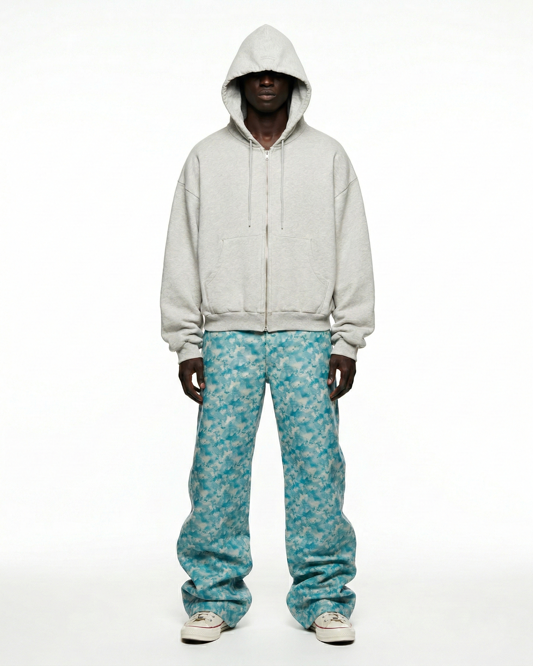 The Mind Bowling Snow Camo Trousers are comprised of vegan leather printed with our snow camo pattern and features a baggy fit.