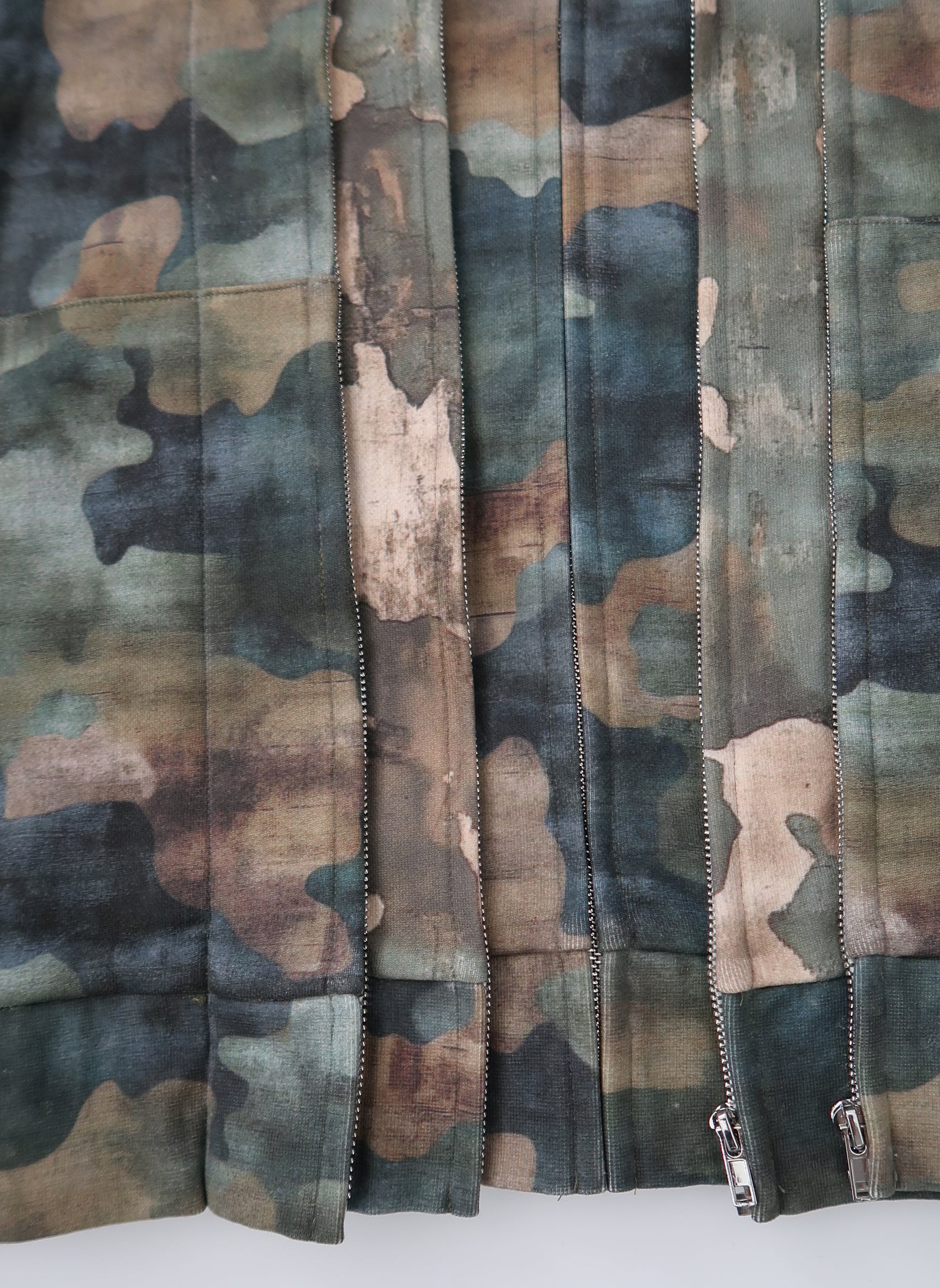 Hooded zip-up sweatshirt crafted from 500 GSM french terry, featuring 3 overlapping camouflage layers that can be individually zipped up. Details include a front kangaroo pocket, and ribbed cuffs and hem. Cut to a relaxed and baggy fit.