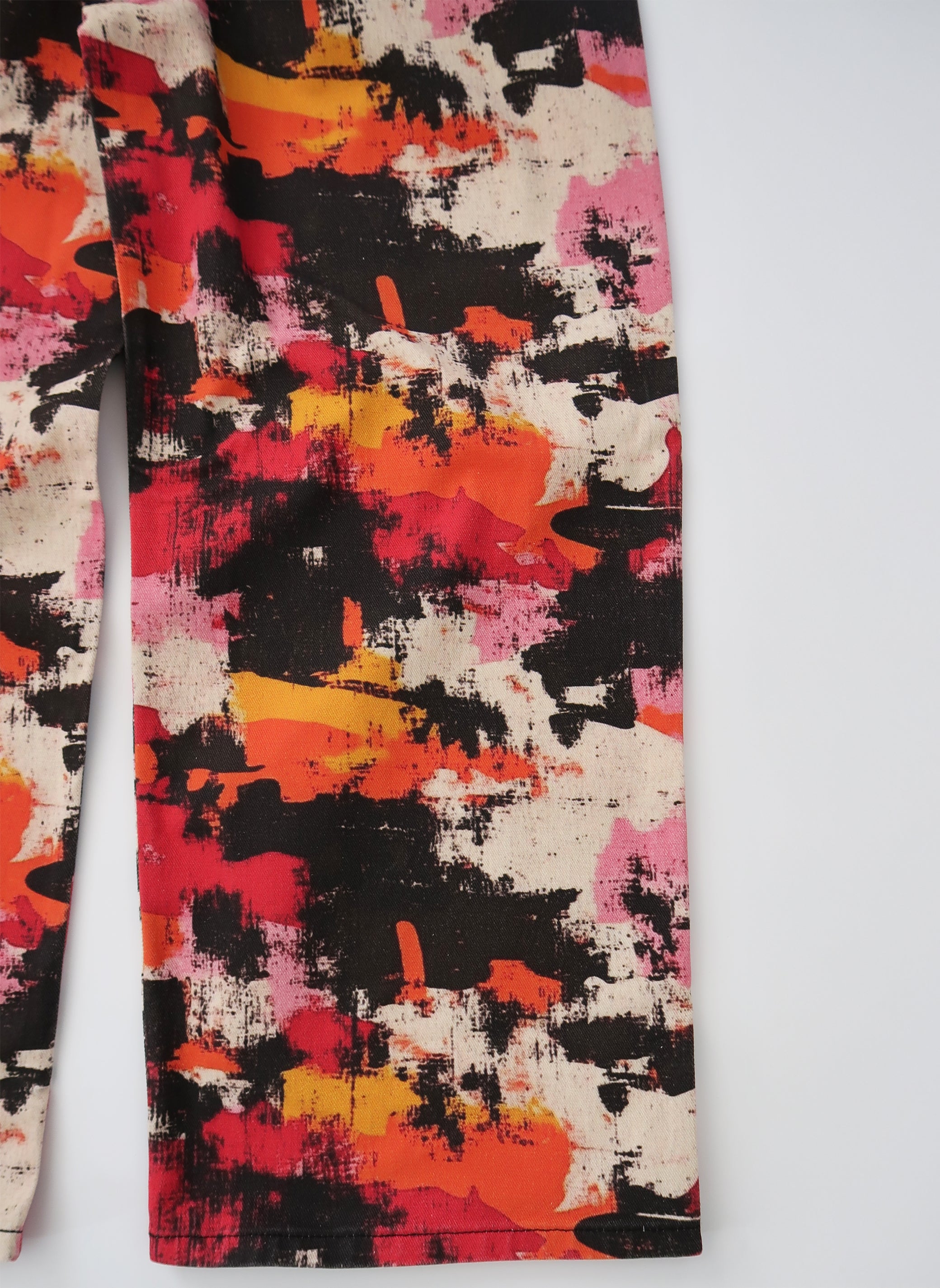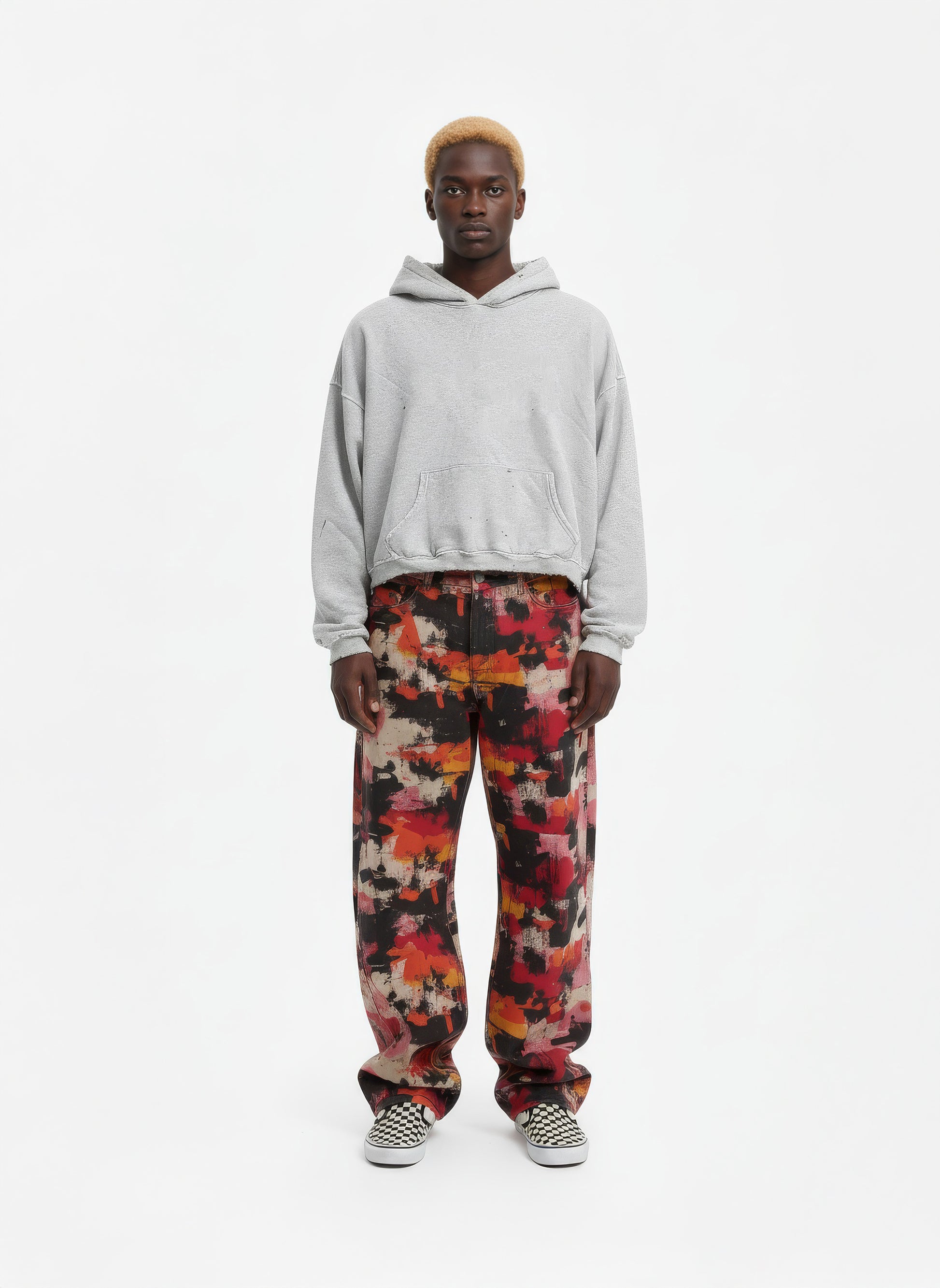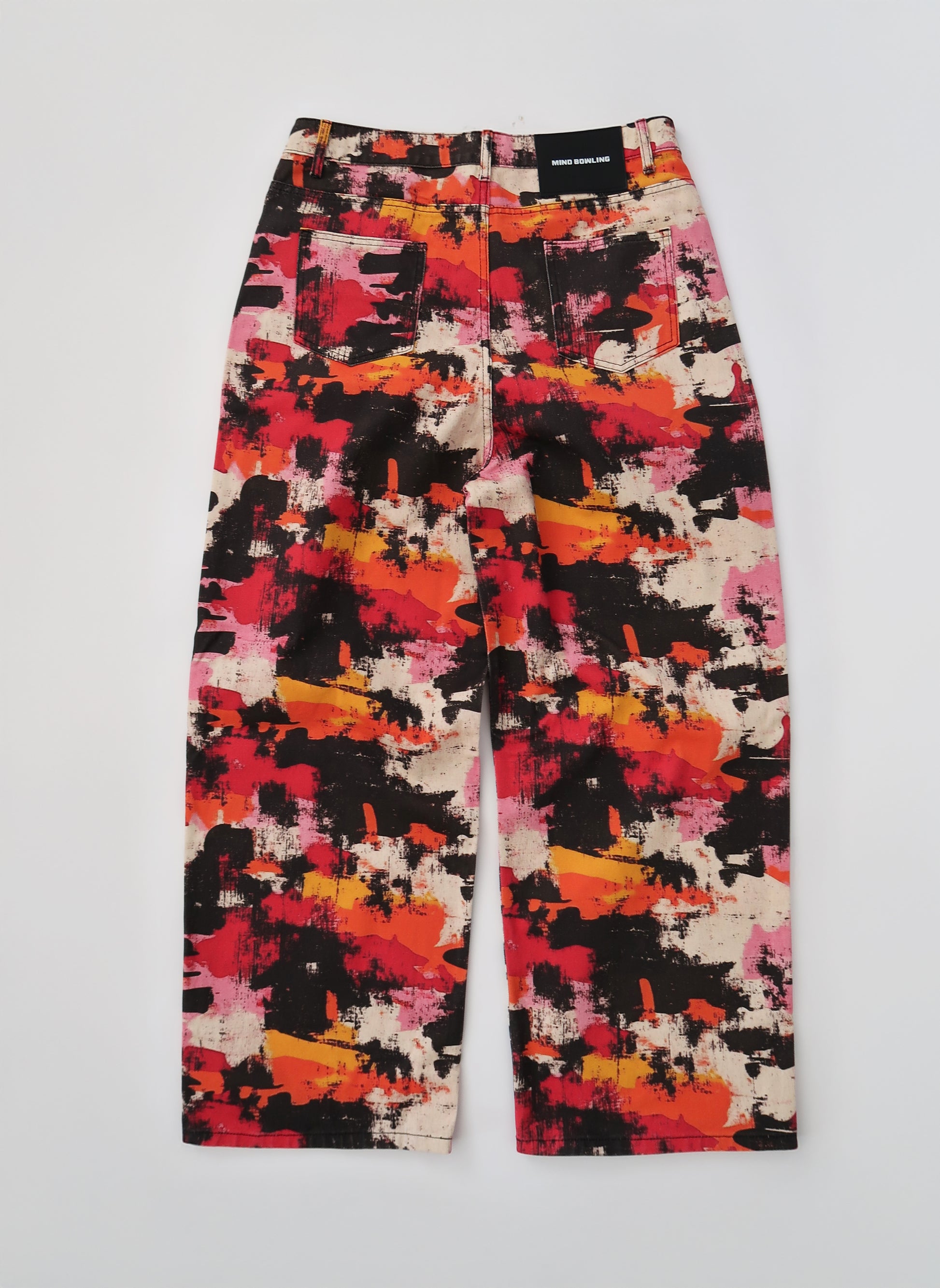 14 oz denim paired with a tropical camouflage pattern, featuring signature Mind Bowling hardware. Cut to a relaxed and baggy fit.